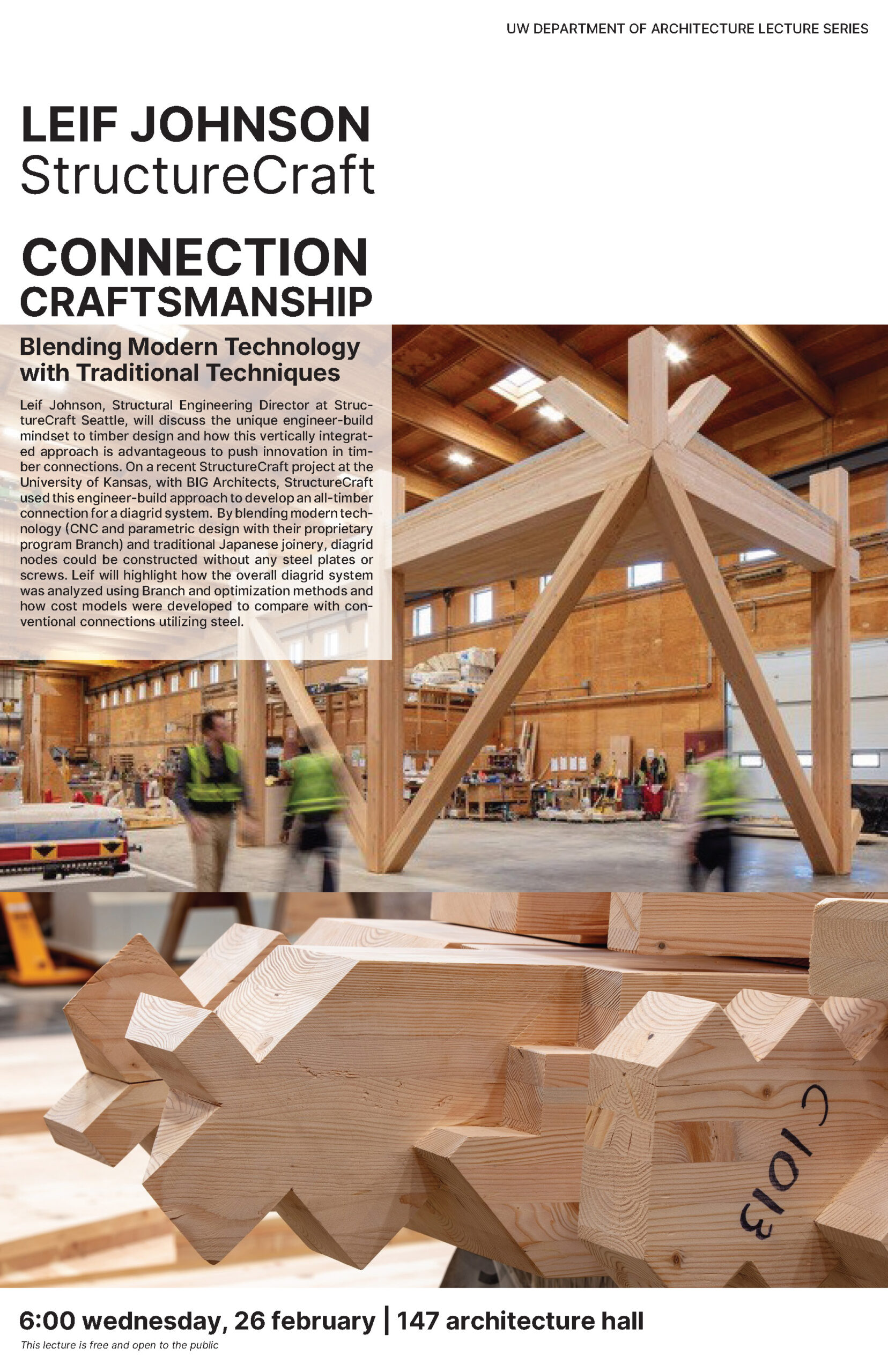 Leif Johnson, Structural Engineering Director at StructureCraft, spoke at the University of Washington’s College of Built Environments in Seattle, Washington on February 26, 2025. His lecture, “Connecting Craftsmanship,” was part of the Department of Architecture Lecture Series.
