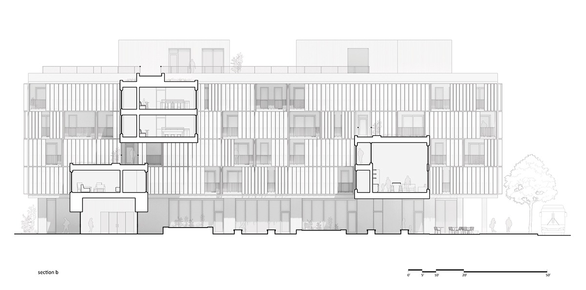 The building’s massing is carefully articulated through carving and strategic openings, allowing visual connections to emerge between interior and exterior spaces. These calibrated sightlines enhance a sense of openness while maintaining moments of privacy. Above, a diverse mix of residential units supports an inclusive community, accommodating a range of lifestyles and needs. Outdoor spaces on upper levels extend toward the adjacent soccer field, offering residents access to light, air, and views. These elevated terraces foster both quiet retreat and social connection, strengthening the relationship between the building and its surrounding landscape.