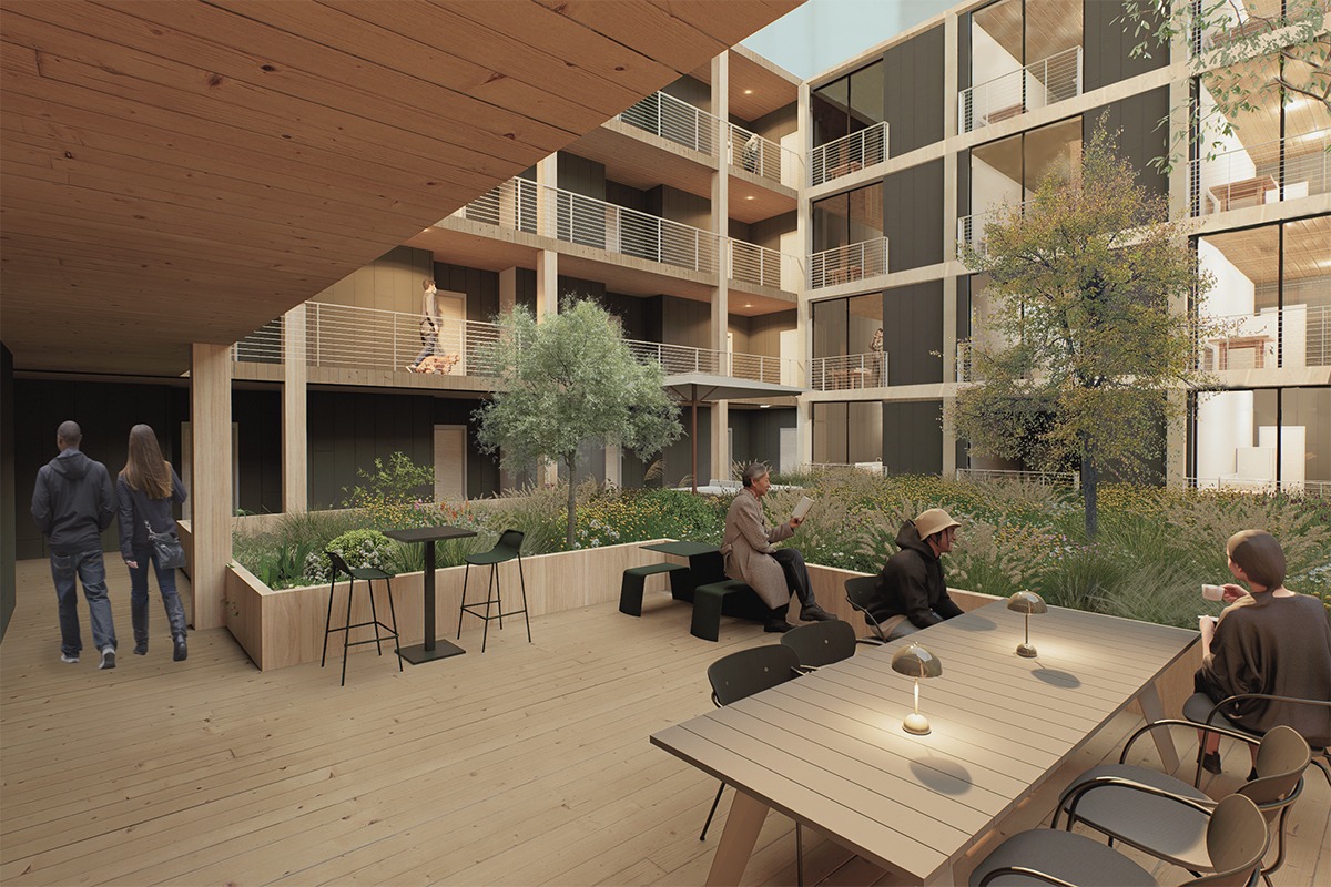 The building uses prefabricated modular construction over a concrete podium to maximize efficiency and accelerate delivery without sacrificing quality. Its design follows trauma-informed and human-centered principles, shaping spaces that feel safe, welcoming, and restorative. A private courtyard introduces light, greenery, and moments of calm within the dense urban setting, while circulation and shared areas encourage interaction among residents. Ground-floor amenities include health services, therapy, and case management, alongside a public-facing food and deli space that connects the building to the surrounding neighborhood. Together, these elements create a supportive environment where housing, care, and community are fully integrated.