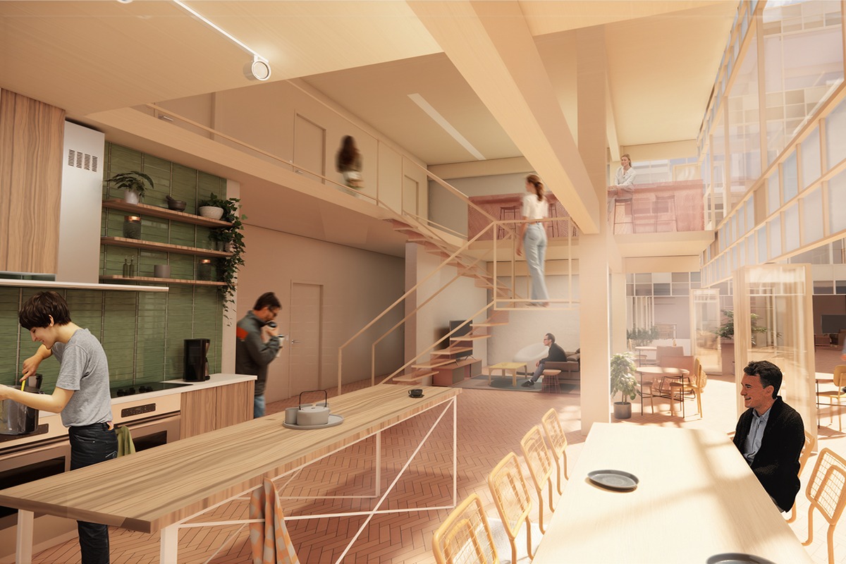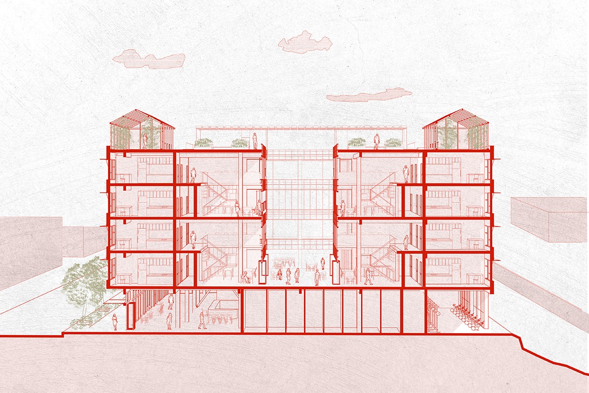 The building’s shared amenities are oriented inward, framing views of the courtyard and strengthening visual and social connections. This design fosters an environment where students naturally gather, study, and connect. Above, rooftop greenhouses and gardens expand the project’s impact by supporting urban agriculture initiatives tied to a nearby culinary school. These spaces provide opportunities for hands-on learning, food production, and community engagement. By linking housing with food-based programming, LINKS creates a living system where residents, students, and neighbors come together through shared experiences, reinforcing both sustainability and social cohesion.
