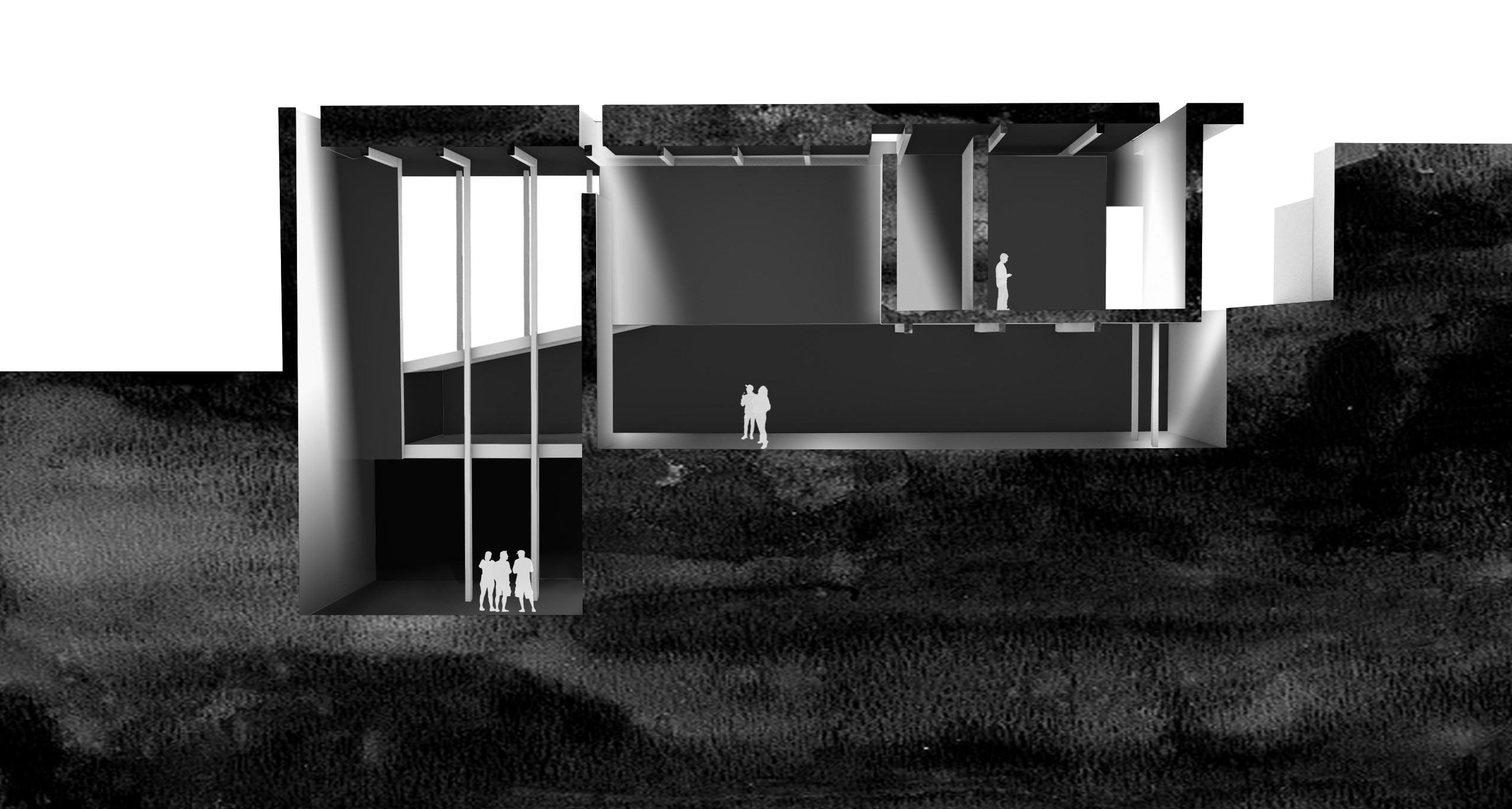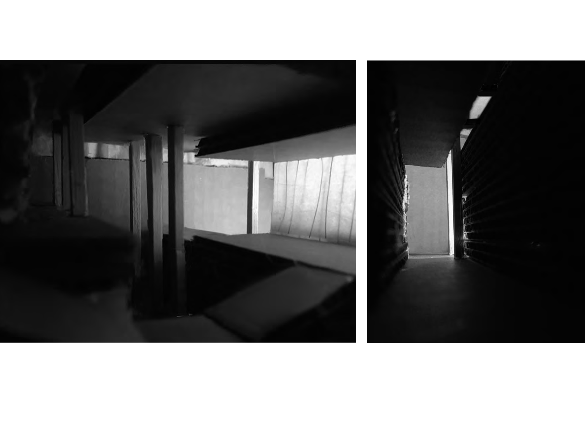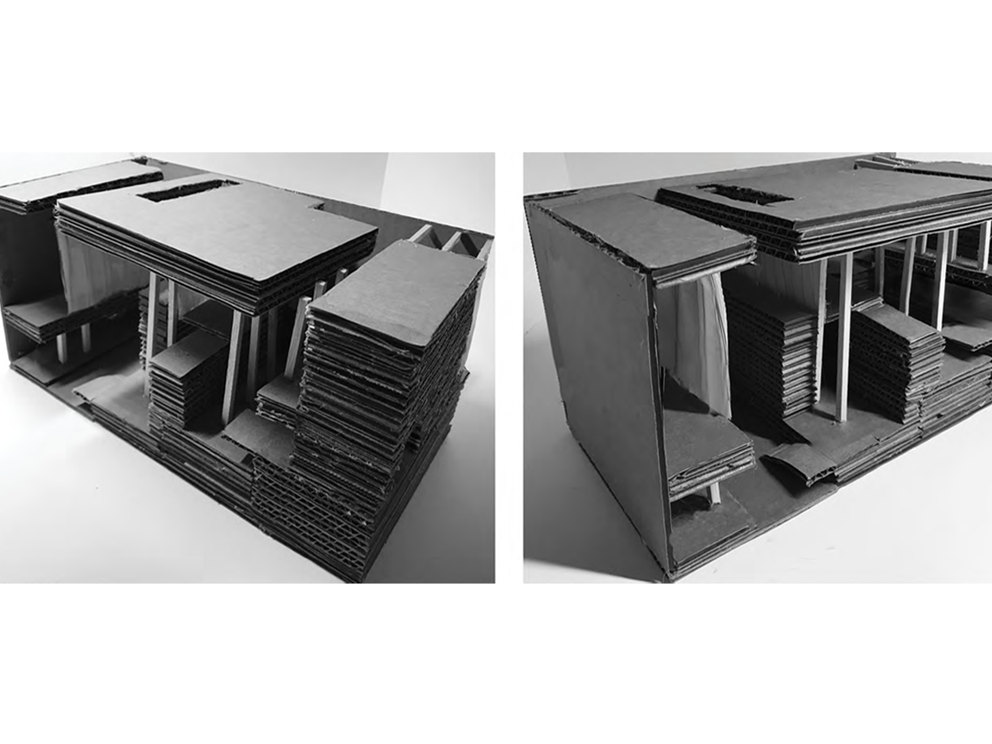 They then moved into simple model-making through paper cubes with distinct voids, combining four cubes into a single configuration and producing orthographic and isometric drawings. In the exhibition, these models formed a larger continuous mass that highlighted both individual work and collective structure.